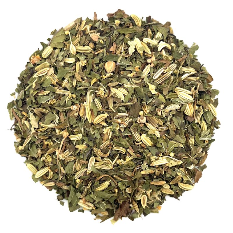 Organic Peppermint Leaf, Organic Fennel Seed, Organic Elder Flowers, and Organic Linden Flower and Leaf.